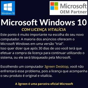 Ao adquirir um computador 3green, você tem a tranquilidade e a comodidade de receber um produto com licença permanente do Microsof Windows 10.