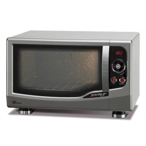 Forno Elétrico Fischer Gratinatto 44 Litros Inox 127v Unindo tecnologia, beleza, praticidade e design moderno, o Forno Elétrico Digital Gratinatto de Bancada Fischer é de fácil programação, traz frontal pintado em preto ou aço inox escovado , display digital, abertura vertical, grade cromada e bandeja para resíduos esmaltada. Possui timer para programação de até quatro horas, ajuste de temperatura de 40 a 300ºC, dourador, luz piloto e luz interna, controle inteligente de temperatura ou seja, absorve a perda de calor quando a porta é aberta. A programação é facilitada com avisos sonoros, o acionamento é eletrônico e o corpo interno é autolimpante. Vidro duplo espelhado e serigrafado: Com função de melhorar o isolamento térmico, o forno possui dois vidros, um interno e outro externo, espelhado. Dourador: Aciona a resistência superior, para dourar os alimentos. Quando acionado, o contorno da tecla ilumina-se em vermelho. Luz interna: Aciona a lâmpada interna do forno, facilitando a visualização dos assados. Quando acionada, o contorno da tecla ilumina-se em vermelho. Display digital: É onde se visualiza o tempo ou a temperatura programados. Durante o pré-aquecimento mostra a palavra "pre" intercalado com o último ajuste (tempo ou temperatura). Após o pré-aquecimento mostra o tempo restante para a conclusão do assado. Anel de Comando de Ajustes: Onde estão as teclas de ajuste para acrescentar e decrementar tempo e temperatura e, no centro, a tecla de liga/desliga/pausa.