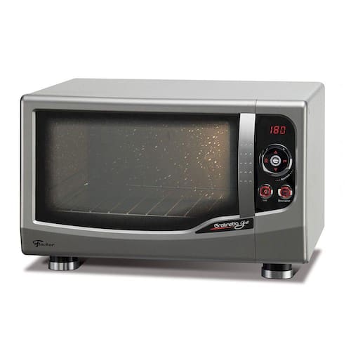 Forno Elétrico Fischer Gratinatto 44 Litros Inox 127v Unindo tecnologia, beleza, praticidade e design moderno, o Forno Elétrico Digital Gratinatto de Bancada Fischer é de fácil programação, traz frontal pintado em preto ou aço inox escovado , display digital, abertura vertical, grade cromada e bandeja para resíduos esmaltada. Possui timer para programação de até quatro horas, ajuste de temperatura de 40 a 300ºC, dourador, luz piloto e luz interna, controle inteligente de temperatura ou seja, absorve a perda de calor quando a porta é aberta. A programação é facilitada com avisos sonoros, o acionamento é eletrônico e o corpo interno é autolimpante. Vidro duplo espelhado e serigrafado: Com função de melhorar o isolamento térmico, o forno possui dois vidros, um interno e outro externo, espelhado. Dourador: Aciona a resistência superior, para dourar os alimentos. Quando acionado, o contorno da tecla ilumina-se em vermelho. Luz interna: Aciona a lâmpada interna do forno, facilitando a visualização dos assados. Quando acionada, o contorno da tecla ilumina-se em vermelho. Display digital: É onde se visualiza o tempo ou a temperatura programados. Durante o pré-aquecimento mostra a palavra "pre" intercalado com o último ajuste (tempo ou temperatura). Após o pré-aquecimento mostra o tempo restante para a conclusão do assado. Anel de Comando de Ajustes: Onde estão as teclas de ajuste para acrescentar e decrementar tempo e temperatura e, no centro, a tecla de liga/desliga/pausa.