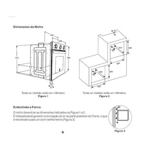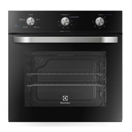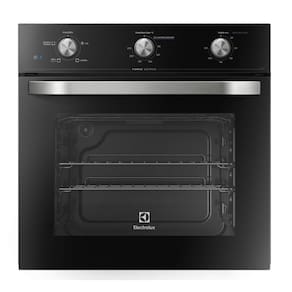 -Marca: Electrolux -Modelo: OE60M -Abertura: Superior (drop down) -Acabamento Frontal: Vidro preto -Acabamento Lateral: Aço -Tensão (V): 220V -Cor: Preta -Capacidade do Forno: 59 litros -Controle Independente de Calor Superior e Inferior: Não -Controles: Manuais (manípulos mecânicos) -Display Eletrônico: Não -Embutir: Sim -Espeto Giratório: Não -Forno Autolimpante: Não -Frequência (Hz): 60 -Funções: 3 funções: Bolos e Massas, Grill e Carnes -Funções Pré-programadas: Sim -Grill: Sim -Isolamento Térmico Total: Não -Lampada Interna: Sim -Dimensões do produto (LxAxP): 59,5 x 59,5 x 50 cm -Dimensões do produto embalado (LxAxP): 65 x 66 x 57 cm -Luz Piloto: Sim -Dimensões do nicho de embutir (LxAxP): 56 x 58,3 x 55 cm -Painel: Sim -Peso bruto (Kg): 32,8 -Peso líquido (Kg) 29,5 -Porta de Vidro Triplo: Não -Porta Removível: Sim -Potência (W): 2000 -Prateleira Telescópica: Não -Prateleiras Deslizantes: Não -Puxadores: Sim -Quantidade de Prateleiras: 2 prateleiras em 4 níveis de altura -Relógio: Não -Resistências Blindadas: Não -Revestimento Interno Antiaderente: Sim -Seletor de Funções: Sim -Temperatura do forno (ºC): 50/250 -Timer: sim -Tipo: Forno de Embutir elétrico -Trava de Segurança: Não -Garantia: 12 meses