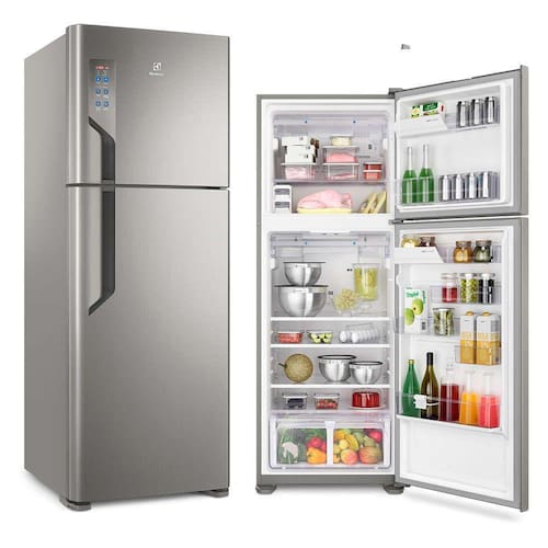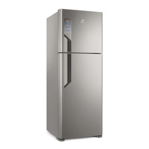 Refrigerador Electrolux Top Freezer 474L Platinum 220V TF56S A geladeira Electrolux Frost Free TF56S foi desenvolvida para ser funcional e moderna, sendo uma excelente opção para armazenar os seus alimentos favoritos com espaço de sobra. Possui um freezer com capacidade de 128 litros, ideal para armazenar sobremesas, carnes e outros alimentos que necessitam de constante refrigeração. Seu espaço interno foi projetado para proporcionar a maior capacidade útil, com prateleiras reversíveis no freezer e no refrigerador, adaptar o espaço interno do seu refrigerador e acomodar diversos alimentos será ainda mais fácil. Suas frutas e verduras possuem um espaço especial na geladeira, através do amplo gavetão que preserva por mais tempo que gavetas comuns. O design moderno do Refrigerador TF56S acompanha painel digital, escolha a função ideal ao toque de um botão. As funções compras, férias e festa escolhem automaticamente a temperatura ideal para cada situação. Melhor visualização do interior da geladeira e baixo consumo de energia elétrica com a iluminação em LED.Conta também com o Icemax, compartimento para produção de gelo com exclusivo sistema sem respingos, sem mistura de odores e fácil de remover. Não espere mais para adquirir um item chave na hora de planejar e decorar, conte com a Electrolux e dê um upgrade na sua cozinha.Especificações Técnicas:- Marca: Electrolux - Modelo: TF56S - 220V - Acabamento da Porta: Platinum - Alarme de Porta: Sim - Capacidade Bruta Congelador (l): 151 - Capacidade Bruta Refrigerador (L): 353 - Capacidade de congelamento (Kg/24h): 8 - Capacidade Dispenser de Água: Não tem - Capacidade Líq. Congelador (l): 128 - Capacidade Liq. Refrigerador (L): 346 - Capacidade líquida do refrigerador (L): 346 - Capacidade Total Bruta (L): 504 - Capacidade Total de Armazenamento (L): 474 - Cesta porta Ovos: Sim - Classificação Energética: A - Compartimento Congelamento Rápido: Sim - Compartimento Extra Frio: Sim - Consumo de Energia (W): 54 - Conteúdo da Embalagem: Embalagem em EPS, com saco plastico em PEBD - Cor da Porta: Platinum - Cor do Gabinete: Platinum - Degelo Automático: Sim - Frequência (Hz): 60 - Iluminação Interna: Sim - Maquina de Gelo Automática: Sim - Material das Prateleiras: Vidro temperado - Painel Digital: Sim - Pés Niveladores: Sim - Dimensões (AxLxP): 189 x 70 x 73.2 cm - Peso líquido (kg): 73 - Prateleiras de Vidro Temperado: Sim - Prateleiras na Porta: Sim - Prateleiras Reguláveis: Sim - Prateleiras Removíveis: Sim - Puxadores: Sim - Quantidade de Portas: 2 - Recipiente para Guardar Gelo: Sim - Rodízios: Sim - Selo Procel: Sim - Separador de Garrafas: Sim - Sistema de Refrigeração: Frost Free - Tecnologia Inverter: FROST FRE - Temperatura do congelador (oC): -18 - Tempo máximo de conservação s/energia (h): 8 - Timer: não - Tipo: 2 Portas - Total de Prateleiras: "Prateleiras internas: 3 Prateleiras na contra porta: 5." - Garantia: 12 meses