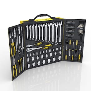 Jogo de Ferramentas Stanley com 110 Peças STMT81243-840Jogo de Ferramentas com aplicações em mecânica, elétrica, encanamentos, entre outros.Conteúdo: • 1 Catraca De 1/4"• 11 Soquetes Sextavados 4, 5, 6, 7, 8, 9, 10, 11, 12, 13, e 14mm• 1 Extensão Fléxivel 100mm• 2 Extensão de 1/4" - 50 e 100mm• 1 Junta Universal (1/4")• 1 Catraca de 1/2"• 15 Soquetes Sextavados 10, 11, 12, 13, 14, 15, 17, 18, 19, 20 21, 22, 23, 24 e 27mm• 2 Extensão de 1/2" - 125 e 250 mm • 1 Adaptador de 3 Vias• 1 Junta Universal De 1/2"• 2 Soquetes P/ Vela 16 e 21 mm• 1 Porta Chave C/ 8 Chaves Hexagonal• 1 Chave Catraca de 1/4"• 2 Chaves de Fenda Ponta Chata 75 e 100 mm• 2 Chave Phillips 75 e 100 mm• 11 Chaves Combinadas 8, 9,10, 11, 12, 13, 14, 15, 17, 18 e 19 mm• 4 Porta Pontas C/ 38 Pontas Para Chave de Catraca• 2 Adapatdor P/ Ponta, 1 Alicate de Corte Diagonal 6"• 1 Alicate de Pnta Longa 8"• 1 Alicate de Extensão Articulado de 10"• 1 Maleta Plástica Articulável?Especificações Técnicas:- Marca: Stanley- Modelo: STMT81243-840 - Drives: ¼", ½”- Contagem de Peças: 110- Acabamento: Cromado- Garantia: 12 meses