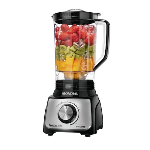 Liquidificador Mondial Turbo Inox 3L Preto 127V L-1100-BIA Mondial trouxe para você o Liquidificador L-1100-BI!Está preparado para ter um liquidificador potente e moderno? Então, a Mondial tem para você o Liquidificador L-1100-BI que possui detalhes em inox, dando durabilidade e sofisticação a sua cozinha e possui uma potência de 1100W, deixando o trabalho difícil com ele. E, além disso, ele é projetado para proporcionar segurança e estabilidade durante o preparo de diversas receitas.Com 3 Litros de capacidade, ele é ideal para famílias que preparam grandes receitas. E conta com um filtro de separação de bagaços e sementes, facilitando ainda mais na hora do preparo de batidas e sucos. Está achando tudo isso incrível? O liquidificador Mondial tem mais! Com 12 velocidades + pulsar,você poderá escolher a velocidade perfeita para os alimentos que vão ser preparados e tem, também, a faca super afiada em Aço Inox, dando mais eficiência ao triturar os alimentos.E para facilitar ainda mais o uso e sua vida, o Liquidificador L-1100-BI possui a Função auto limpeza que auxilia na limpeza do copo do liquidificador e as suas lâminas. Para usar essa Função basta encher o copo até metade com água e um pouquinho de detergente e depois, aperte o botão pulsar algumas vezes e pronto!Especificações Técnicas:- Marca: Mondial- Voltagem: 127V- Modelo: L-1100-BI- Cor: Preto/Inox- Potência: 1100W- Capacidade: 3,0L- Porta-fio: Sim- Dimensões do produto (LxAxP): 27,5 x 35,5 x 21 cm- Dimensões do embalado (LxAxP): 65 x 72 x 28,5 cm- Peso: 2,5 kg- Garantia: 12 meses