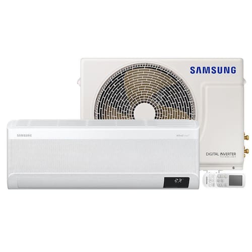Ar Condicionado Split Inverter Samsung WindFree™ 12000 BTU Branco Inverter 220V AR12AVHABWKXAZTodo o conforto térmico que sua família precisa com o incrível Ar Condicionado Split Inverter Samsung WINDFree. Com 23.000 microsaídas de ar responsáveis pela dispersão de ar que garante ampla refrigeração sem o incomodo do vento direcionado. Com Design modular simples e leve, é capaz de ser instalado em 45% menos tempo além de trazer a climatização ideal sem grandes interferências na sua decoração.O compressor Digital Inverter, com 10 anos de garantia, garante além de grande resistência e durabilidade por obter serpentina de cobre uma operação muito mais silenciosa possuindo um silenciador de tubo duplo, reduzindo o ruído tanto em alta quanto baixa velocidade. A tecnologia Digital Inverter também é muito mais eficiente e aliada ao Fast Cooling é capaz de resfriar ambientes até 43% mais rápido. Este compressor Digital Inverter também economiza até 77% de energia, pois ao entrar no modo WindFree, ele opera consumindo o mínimo de energia, mantendo a temperatura estável sem desligar e ligar frequentemente. Eficiência, conforto e tecnologia para você aproveitar o máximo do seu aparelho. Cuidando da sua saúde, este ar condicionado se mantem sempre limpo com a tecnologia Auto Clean, que remove automaticamente o pó e a umidade no trocador de calor, mantendo ele limpo, seco e evitando o crescimento de bactérias e mofo quando o aparelho é desligado. Também possui o Easy Filter Plus, que matem o ar fresco, mantendo a limpeza na parte interna da unidade, este filtro é capaz de eliminar até 99% de bactérias e alérgenos ao passarem por uma densa malha de filtro antibacteriana. Aliada a essas duas tecnologias de limpeza, conta também com o Modo Good Sleep, que cria um clima ideal controlando a estabilidade da temperatura a noite toda. Devida a Tripla Proteção, se mantem funcionando até mesmo nos ambientes mais difíceis. Mesmo sem um estabilizador de corrente separado, evita sobrecargas e possui revestimento anticorrosão que suporta condições diversas. Especificações Técnicas:- Marca: Samsung- Modelo: AR12AVHABWKXAZ- Voltagem: 220V - Ciclo: Frio- Tipo: Split- Cor: Branco- Capacidade: 12.000 BTU- Corrente de Resfriamento: 5,4 A- Classificação Energética: A- Potência Resfriamento: 1085 W- Linha de Líquido: 6,35 mm | 1/4"- Linha de Gás: 9,52 mm | 3/8"- Desnível Máx.: 7m- Distância Máx.: 15m- Tipo de Gás: R410A- Carga de Gás da Fábrica: 0,95Kg - Trocador de Calor: Cobre- Velocidades: Eco/Fan/Auto- Timer: Sim- Wind Free: Sim- Modo Sleep: Sim- Auto Clean: Sim- Função Swing: 4 Direções- Dimensões da Unidade Interna (LxAxP): 88,9 x 29,9 x 21,5 cm- Dimensões da Embalagem da Unidade Interna (LxAxP): 95 x 37,5 x 29 cm- Dimensões da Unidade Externa (LxAxP): 66 x 47,5 x 42 cm- Dimensões da Embalagem da Unidade Externa (LxAxP): 77,8 x 55 x 33,1 cm- Peso Líquido da Unidade Interna: 9,8 Kg- Peso Líquido da Unidade Externa: 20,5 Kg- Peso Bruto da Unidade Interna: 11,1 Kg- Peso Bruto da Unidade Externa: 22,2 Kg- Garantia: 12 meses