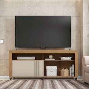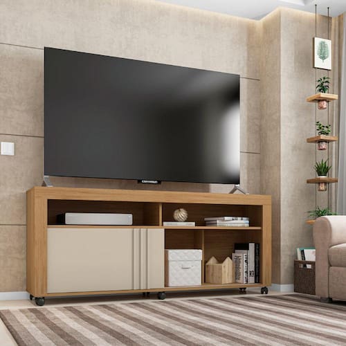 Rack Caemmun Joy Buriti / Off White 8000200004-303O Rack Caemmun Joy foi desenvolvido para dar um toque único à sua sala. Com seu design robusto e assinatura especial e com o detalhe em recorte laser no MDF irão deixar sua sala muito mais moderna. São 2 amplos nichos na parte superior, e na inferior mais 2, e ainda conta com espaço fechado com porta deslizante, perfeito para que além de manter os eletroeletrônicos, você possa abusar da decoração e ainda mantém seus objetos guardados. Para facilitar o seu transporte ainda conta com 4 rodízios e suporta televisores até 60 polegadas.Especificações Técnicas:- Marca: Caemmun- Modelo: 8000200004-303- Cor: Buriti / Off White- Estrutura: HDF 2,5mm / MDP 15 mm- Revestimento: UV- Dimensões do Produto (LxAxP): 160 x 70 x 36 cm- Dimensões da Embalagem (LxAxP): 179,6 x 10,9 x 40 cm- Peso líquido: 30,15 kg- Peso bruto: 31,45 kg- Garantia: 3 meses