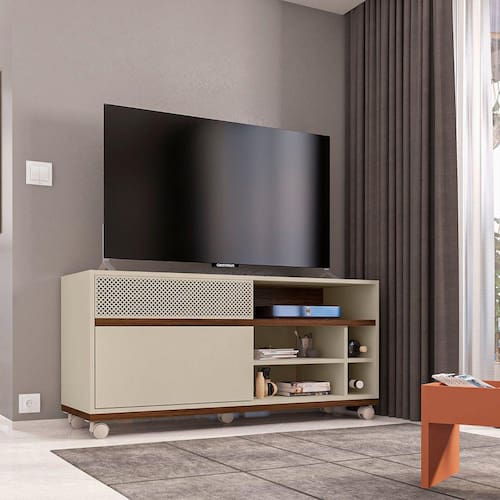 Rack Caemmun Slide Off White/Havana 8000200005-326Procurando um móvel que complemente sua sala, de maneira moderna e arrojada? O Rack Slide Caemmun é o ideal para você!Seu design diferenciado traz um toque de requinte e sofisticação ao ambiente. Suas cores naturais permitem uma grande variedade de combinação com os mais diversos tipos de decoração. O Rack Slide Caemmmun possui exclusivo acabamento em 3D laser, trazendo um padrão único e deixando ele muito mais interessante.Combinado ao design, conta com nichos com amplo espaço afim de auxiliar na organização de seus eletrônicos, além é claro de poderem ser utilizados para os mais diversos objetos decorativos como livros, vasos, fotos, garrafas etc. Também conta com sua porta deslizante que traz muito mais opções na composição da sua decoração. Sua estrutura feita em MDP e MDF e acabamento de pintura UV tornam este Rack muito mais durável estável. Possui capacidade para televisores de até 50 polegadas. Conta também com 06 rodízios, o que facilita a mobilidade do móvel. - Cuidados: Utilizar apenas pano umedecido com água e nunca utilizar produtos abrasivos ou esponjas de aço para limpeza.- A Continental Center não se responsabiliza pela montagem, instalação ou reparo do produto.Especificações Técnicas:- Marca: Caemmun- Modelo: Slide Off- Referência: 8000200005-326- Tipo: Rack- Cor: White/Havana- Capacidade: Televisores até 50 polegadas- Material: MDP/MDF de 15mm e 25mm - Acabamento: Pintura com acabamento UV- Rodizios: 06- Portas: 01- Itens Inclusos: 01 Rack, Manual e Acessórios para montagem.- Número de Volumes: 1 volume- Dimensões do Produto (LxAxP): 120 x 57,9 x 38,5 cm- Dimensões da Embalagem (LxAxP): 127 x 11 x 51 cm- Peso Líquido: 30,25 Kg- Peso Bruto: 31,26 Kg- Garantia: 3 meses