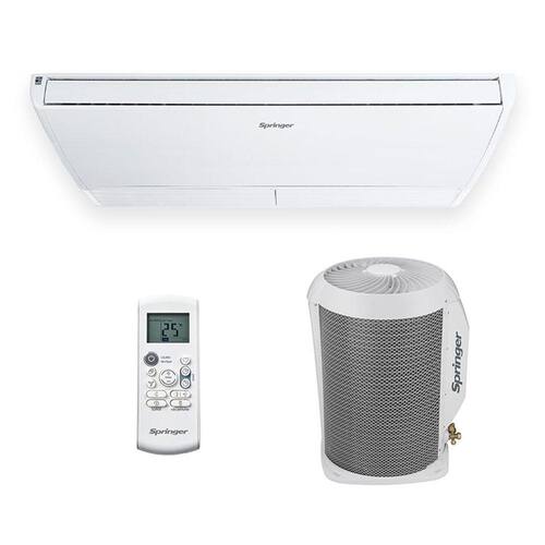 A linha de ar-condicionado Split Teto Springer Space Air é ideal para estabelecimentos comerciais, trazendo maior conforto térmico, operação silenciosa e robustez aliado a um design moderno e agradável. Possui condensadora leve, compacta e robusta, com descarga vertical, que ocupa menos espaço e facilita a instalação e manutenção, e possui serpentina em cobre que garante maior vida útil, confiabilidade e robustez. Evaporadora fácil de limpar, com filtro de tela lavável de simples acesso. Disponível nas capacidades 24.000, 36.000 e 57.000 BTU/h frio. O ar-condicionado Split Teto Springer Space Air possui uma flexa de ar de longo alcance, podendo chegar até 15m de distância, distribuindo melhor e de forma uniforme o fluxo de ar, proporcionando melhor conforto térmico. Com o defletor de ar 360° com 5 posições, evita que o fluxo de ar vá direto nas pessoas, criando uma sensação de conforto ainda maior. Operação silenciosa através do ventilador interno especialmente desenvolvido para proporcionar um ambiente agradável. Função Super: Faz com que o ar-condicionado opere em sua capacidade máxima subindo fazendo com que a temperatura selecionada seja alcançada muito mais rápido. Função Favorito: Usada para restaurar as configurações atuais ou retomar as configurações anteriores. Função Não Perturbe: Desativa o sinal sonoro e desligara luz do display da unidade interna, propiciando um ambiente confortável e tranquilo Função Dormir: A temperatura ajustada será controlada para maior conforto e economia. Em modo AUTOMÁTICO OU REFRIGERAÇÃO, a temperatura configurada aumentará 1°C por hora nas primeiras duas horas, mantendo-se então estável pelas próximas 7. Função Timer (Temporizador): Programe seu ar-condicionado para ligar e desligar no horário desejado, com uma programação simples e rápida. Função Oscilar: Essa função ativa o movimento automático das aletas horizontais e função Direção, que altera o ângulo das aletas. 4 modos de operação: Automático, Refrigeração, Ventilação e Desumidificação e 4 velocidades de ventilação: Baixa, Média, Alta e Automática. Fluido Refrigerante Ecológico R-410A. Atóxico, não inflamável e não agride a Camada de Ozônio.