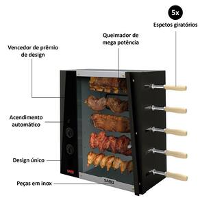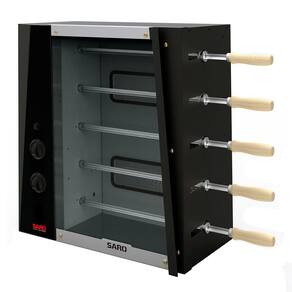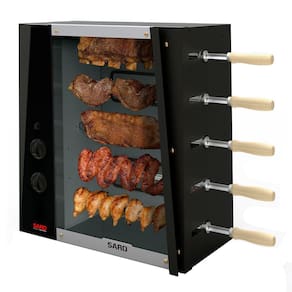 Assador Elétrico Rotativo Saro 05 Espetos 127V CHR11 Com design moderno e inovador, essa churrasqueira foi projetada para atingir alta performance e versatilidade. Os amantes do churrasco ficaram muito mais felizes com esse modelo que proporciona comodidade e eficiência em um único produto. Sem fazer fumaça, é indicada para locais com pouco espaço ou sem saídas de ventilação.Seus 5000 de potência trazem ainda mais força aos seus queimadores, assando o alimento de maneira muito mais veloz. Com capacidade de assar até 7,5kg de alimentos por vez, sendo capaz de atender sua famílias e amigos da melhor maneira possível (15 pessoas). Ela ainda garante muito mais suculência por conta da sua bacia de água que fica a baixo da grelha.Especificações Técnicas:- Marca: Saro- Modelo: CHR11- Voltagem: 127V- Tipo: Churrasqueira Elétrica- Cor: Preta- Capacidade Total: 7,5kg- Capacidade por Espeto: 1,5kg- Potência: 5000W- Temperatura máxima: 350ºC- Consumo elétrico: 2,4 Kw/h- Material: Peças aço inox 304- Acendedor Automático: Sim- Bandeja Coletora de Gordura: Sim- Queimador Infravermelho de Alto Calor: Sim- Fio Anti-Chamas: Sim, certificado pelo INMETRO- Ditância Entre os Espetos: 12 cm- Dimensões do Produto (LxAxP): 55 x 65 x 33 cm- Dimensões da Embalagem (LxAxP): 60 x 70 x 38 cm- Peso Líquido: 24kg- Peso Bruto: 25kg- Garantia: 12 meses