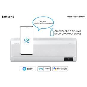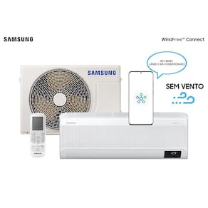 Ar Condicionado Split Inverter Samsung WindFree Connect 12000 BTUs Frio 220V AR12BVFAAWKXAZAmbientes confortáveis e com a climatização na temperatura ideal. Conheça agora o Ar Condicionado WindFree Connect da Samsung, alta performance e projetado para se adequar as necessidades do dia a dia, sem a sensação desagradável do vento direcionado. O ar é disperso suavemente através de 23.000 microssaídas de ar para que você não sinta nem muito calor, nem muito frio.Com compressor Digital Inverter, o WindFree Connect garante alta eficiência energética, sendo capaz de atingir economia de até 77% de energia comparado aos modelos convencionais. Você ainda tem a possibilidade de controlar os gastos e consumo de energia em tempo real com a função SmartThings Energy. Esse mesmo aplicativo permite que você possa ligar e desligar, controlar a temperatura e muito mais até mesmo por comando de voz.Com capacidade de climatizar autonomamente seus ambientes de maneira muito mais inteligente usando o AI Auto Cooling que é capaz de otimizar os modos, analisando as condições da sala e os padrões de uso. Utilizando a sua temperatura preferida como base, ele alterna automaticamente o modo mais apropriado para manter as condições ideais.Seu design diferenciado com maiores aberturas, aliado ao poderoso compressor Digital Inverter traz resfriamento muito mais rápido e com muito mais alcance. Com sistema de dois filtros, com revestimento antibacteriano e lavável para reter até 99.9% de bactérias e outro capaz de reter também 99.9% de vírus presentes no ar.Essa linha conta com função de limpeza automática que opera sozinha um ventilador para remover pó e umidade no trocador de calor, mantendo o equipamento limpo, seco e evitando o crescimento de bactérias e mofo. Ainda conta bom botão especial no aplicativo SmartThings que esteriliza o ar condicionado congelando 90% das bactérias do interior do equipamento.Pensando na comodidade do seu sono, o WindFree Connect conta com modo Good Sleep que monitora a temperatura e a umidade do ambiente, trazendo conforto térmico durante toda a noite. Ele também conta ruído reduzido mesmo com um fluxo de ar poderoso e operando em alta velocidade.Aliando a sua alta performance uma durabilidade muito maior, o compressor digital Inverter conta com 10 anos de garantia e também serpentina de cobre que garante maior resistência e vida útil. Seu design é modular, simples, leve e traz maior facilidade para instalação com apenas 2 parafusos e partes de encaixe, garante 45% mais rapidez na instalação.Especificações Técnicas:- Marca: Samsung- Modelo Unidade Interna: AR12BVFAAWKNAZ- Modelo Unidade Externa: AR12BVFAAWKXAZ - Voltagem: 220V - Tipo: Ar Condicionado Split Inverter- Cor: Branco- Ciclo: Frio- Capacidade: 12000 Btus- Capacidade de Refrigeração: 13600 Btu/h- Potência: 1280W- Classificação Energética: A- Eficiência Energética: 6W/W- Consumo de Energia: 485kwh/mês- Vazão: 672m³/h- Nível de Ruído da Unidade Interna: 38/21- Nível de Ruído da Unidade Externa: 50- Tipo de Serpentina: Cobre- Linha Liq: 1/4"- Linha de Gás: 3/8"- Velocidades: Fan/Eco/Auto- Filtro: Tri Care Filter- Função Swing: 4-Direções- Modos de Operação: Auto/Cool/Fan/Dry- Corrente de Refrigeração: 5.9- Tipo de Compressor: Inverter- Carga de Gás Fabrica: 0.82kg- Gás Refrigerante: R410- Desnível: 8m- Distância: 15m- Purificador de Ar Vírus Doctor: Não- Aviso para Limpar Filtro: Sim - Direcionador Horizontal: Sim- Proteção Anticorrosão: Sim- Direcionador Vertical: Sim- Tecnologia inverter: Sim- Controle Remoto: Sim- Ionizador Care: Não- Energy Saving: Sim- Wind Free: Sim- Modo Dry: Sim- Tecnologia Turbo: Sim- Timer: Sim- Modo Sleep: Sim- Auto Clean: Sim- Freeze Wash: Sim- Dimensões da Unidade Interna (AxLxP): 29,9 x 82 x 21,5 cm- Dimensões da Unidade Externa (AxLxP): 47,5 x 66 x 24,2 cm- Dimensões da Embalagem da Unidade Interna (AxLxP): 29 x 88 x 37,5 cm- Dimensões da Embalagem da Unidade Externa (AxLxP): 55 x 77,8 x 33,1 cm- Peso Líquido da Unidade Interna: 8,9kg- Peso Líquido da Unidade Externa: 20,7kg- Peso Bruto da Unidade Interna: 10,2kg- Peso Bruto da Unidade Externa: 22,4kg- Garantia do Compressor: 10 anos- Garantia: 12 meses