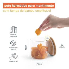 Esse é o Kit de Potes de mantimento empilhável redondo de 500Ml da Oikos.Esse é o pote de mantimentos empilhável com tampa de bambu 500ml da OIKOS. Cabe em qualquer lugar: ajuda a aproveitar melhor o espaço.Tampa hermética: sua tampa possui um anel de vedação de silicone que veda de verdadeMestre da na conservação: a combinação da vedação de silicone com o bambu antibacteriano garante melhor conservação dos alimentos que duram por muito mais tempo. Versátil: não é só de comida que vive esse pote: pisca-pisca, pregadores de roupa, decoração de Natal, nozes, flores secas, fios, jogos e o que mais você quiser guardar - isso que é versatilidade.Esse kit é composto por:4 potes de Mantimento Empilhável Redondo 500ml da Oikos.Altura: 10 cm - Diâmetro: 9,8 cm