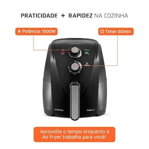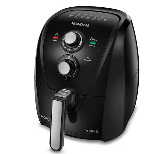 Tipo de alimentos que comporta: Batata frita congelada (12 min.), Nuggets (15 min.), Frango (20 min.), Carnes (12 min.) Peixes (10 min.), Pão de queijo (15 min.), Bolo (30 min.)
