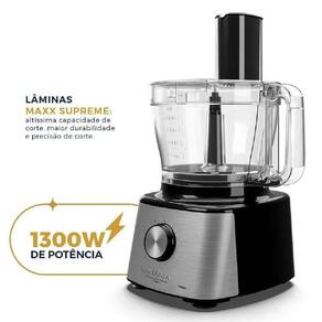 Funções: 01 Copo de liquidificador, 01 jarra de multiprocessador, 01 espremedor de frutas, 01 adaptador de lâminas, 01 lâmina de fatiar, 01 lâmina de ralar, 01 lâminas de processar, 02 velocidades + pulsar, Pés antiderrapantes, Trava de segurança, processar, ralar, cortar, fatiar, espremer, picar, liquidificar.