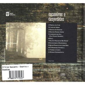 Livro + Cd Milton Nascimento - Encontros E Despedidas Encontros e Despedidas é um álbum do cantor e compositor Milton Nascimento, lançado em 1985 , relançado em 2012 em comemoração aos 50 anos de carreira. Faixas: 1- Portal da Cor, 2- Caso de amor,3- Noites do Sertão, 4- Mar Do Nosso Amor, 5- Lágrima Do Sul, 6- Raça, 7- Pra Eu Parar De Me Doer, 8- Encontros e Despedidas, 9- Quem Perguntou Por Mim, 10- A Primeira Estrela, 11- Vidro e Corte, 12- Rádio Experiência Ficha Técnica Ano de Publicação: 2012 Classificação Indicativa: Livre Faixas Adicionais: Não Físico/Digital: Físico Gênero: MPB Nome do Artista: Milton Nascimento Nome do álbum: Milton Nascimento - Encontros e Despedidas País de Origem: Brasil Quantidade de Discos: 1 Quantidade de Músicas: 12 Título: Milton Nascimento - Encontros e Despedidas