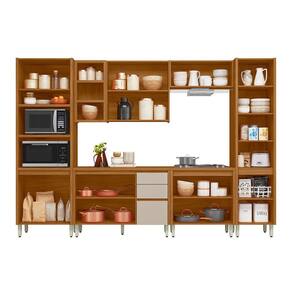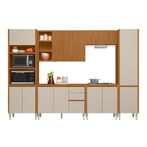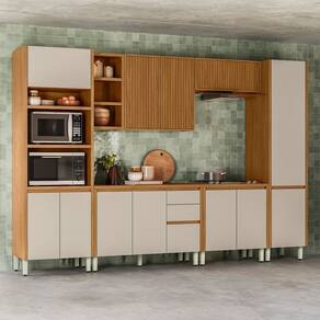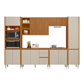 Apresentamos o Conjunto de Cozinha 6 Peças com Torre Quente e Porta Ripada MICHELANGELO - uma opção completa e elegante para sua cozinha. A torre quente oferece espaço para acomodar tanto o forno elétrico quanto o micro-ondas, proporcionando praticidade e funcionalidade. O armário aéreo de 1,20 metros possui portas com acabamento ripado e nichos, adicionando um toque de sofisticação e modernidade ao ambiente. Além disso, o conjunto inclui um Paneleiro para facilitar a organização. Com um armário aéreo simples de 80 cm e um balcão de 80 cm, você ganha ainda mais espaço de armazenamento. Os balcões possuem regulagem de altura para se adaptar às suas necessidades, enquanto as portas contam com acabamento em 45º e dobradiças com amortecimento para um fechamento suave. Com puxadores metálicos nos módulos aéreos, este conjunto une funcionalidade, estilo e praticidade, elevando o padrão da sua cozinha.