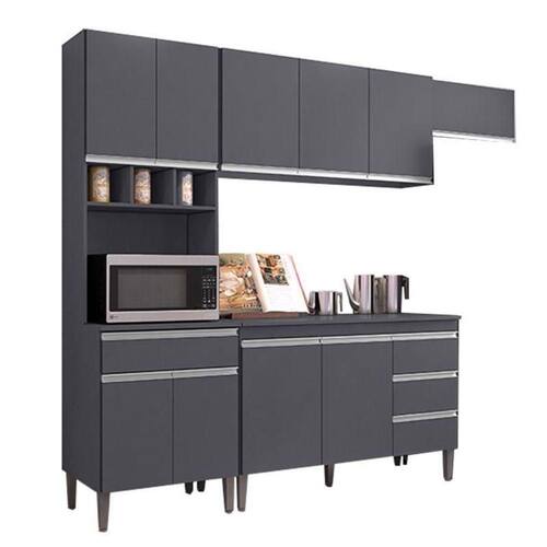 Sua cozinha ideal está aqui, pensando em você que não tem muito espaço e procura por cozinha compacta apresentamos essa linda opção, a Cozinha da linha Andréia desenvolvida com todo carinho pela AJL com excelentes materiais de qualidades para maior durabilidade do móvel, composta por Armário Aéreo Geladeira, Armário Aéreo 3 Portas, Paneleiro Duplo e Balcão com Tampo 120cm com lindo design na cor Cinza Fosco proporcionando modernidade e um toque especial em sua cozinha, possui amplo espaço interno para melhor organizar seus utensílios, praticidade, conforto e acompanham seu dia a dia. Não deixe de aproveitar, garanta a sua!