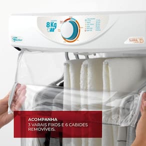 Projetada cuidadosamente com 3 varais fixos e 6 cabides removíveis, esta secadora otimiza o espaço e oferece opções flexíveis para organizar suas roupas. Sua construção durável apresenta um painel de controle em termoplástico com indicações de tempo de secagem, um revestimento externo em aço pintado e uma bolsa de PVC cristal com fechamento seguro por zíper e fecho aderente. O manipulador em termoplástico complementa seu design prático.