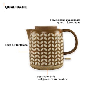 Distribuído por feheros shop Chaleira elétrica porcelana elegance marrom 1l base 360 desligamento automático Atenção Esta chaleira elétrica é feita em porcelana, material mais delicado e sofisticado que o inox ou o plástico. Portanto, embora elegante, requer mais cuidado durante o manuseio. Nunca utilize diretamente no fogão ou forno. Produto exclusivo para uso com a base elétrica que acompanha. A chaleira possui desligamento automático ao atingir o ponto de fervura, evitando superaquecimento, mas deve ser sempre Utilizado com água no interior, respeitando o nível mínimo e máximo indicado. Evite quedas, choques térmicos ou batidas. - leia atentamente a descrição e siga o passo a passo que o fabricante recomenda. Informações do produto Essencial para qualquer lar, a chaleira elétrica porcelana elegance marrom apresenta design elegante e atemporal que une funcionalidade e segurança. Seu acabamento em porcelana na sofisticada cor marrom conta com detalhes amadeirados, trazendo um toque natural que valoriza qualquer cozinha. Aquece água com rapidez e estilo para cafés, chás, infusões e uso culinário. Com capacidade de 1 litro, é compacta e eficiente, perfeita para quem deseja agilidade e charme em um só produto. Conta com base giratória 360, desligamento automático e proteção contra superaquecimento, garantindo segurança e conforto no uso. Especificações técnicas - capacidade de 1l, ideal para uso individual ou pequeno volume - fabricada em porcelana de alta qualidade, com acabamento resistente e sofisticado - tampa com vedação em silicone, garantindo fechamento seguro e evitando vazamentos - base giratória 360 removível, facilitando o manuseio para destros e canhotos - desligamento automático ao atingir a fervura, protegendo contra superaquecimento - botão liga/desliga com luz indicadora de funcionamento - design decorativo em porcelana marrom com detalhes amadeirados, funcional e elegante - mais eficiente que micro-ondas e mais segura que chaleiras de fogão Ficha técnica do produto - capacidade: 1 litro - altura com base: 19,5 cm - largura: 23,5 cm com alça - diâmetro da base: 15,5 cm - peso: 0,900 kg - material da chaleira: porcelana - material da base: polipropileno com componentes elétricos - frequência: 60 hz - cabo: 80 cm - cor: marrom - desligamento automático - base giratória 360 Antes e depois do primeiro uso - antes de utilizar, verifique se a voltagem da chaleira é compatível com sua tomada. Para a primeira utilização, ferva água uma vez e descarte o conteúdo, eliminando possíveis resíduos de fábrica. Se necessário, repita o processo. - após o uso, aguarde a chaleira esfriar totalmente antes de lavar. Faça a limpeza com esponja macia e sabão neutro. Evite molhar a base elétrica ou utilizar produtos abrasivos. Itens inclusos no pacote - 01 chaleira elétrica de porcelana elegance marrom 1 litro - 01 base elétrica com rotação 360 - 01 manual de instruções Todas as fotos são reais dos produtos. Qualquer dúvida, estamos à sua disposição Dúvidas frequentes 01 - a chaleira é feita totalmente em porcelana R: sim. O corpo da chaleira é 100% porcelana de alta qualidade, com acabamento elegante. 02 - posso usar a chaleira no fogão ou micro-ondas R: não. O produto deve ser somente com a base elétrica fornecida. Não utilize diretamente em fogo, forno ou micro-ondas. 04 - como posso acompanhar o envio R: após o despacho, acompanhe a entrega através do código de rastreamento enviado para sua conta.