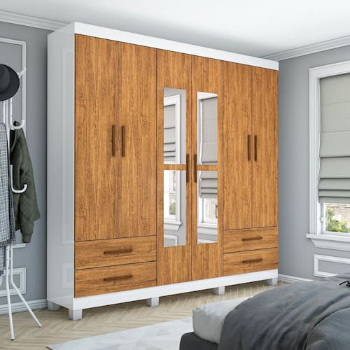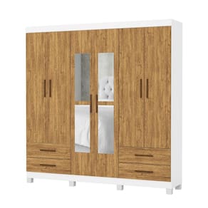 O Guarda-Roupa Genova 6 Portas 4 Gavetas com Espelhos e Pés, é ideal para quem procura um produto compacto e funcional. Possui 2,07m de altura, 1,77m de largura e 0,47m de profundidade combinado com 4 gavetas, 4 prateleiras e um grande cabideiro, deixando o produto com uma ótima divisão interna. O maleiro é ideal para guardar malas, cobertores, edredons. O cabideiro além de resistente, é ideal para pendurar pares de blusas, camisas acessórios. As prateleiras são perfeitas para colocar roupas como blusas, shorts, regatas, kits de maquiagem, toalhas, caixinhas com acessórios e bolsas menores. As gavetas fixadas sobre corrediças metálicas, são ideais para guardas blusas dobradas, shorts, malhas e roupas íntimas. Estrutura do produto em MDP.