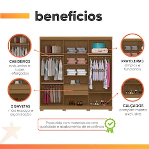 DIFERENCIAL: Puxadores em MDF / Corrediças telescópicas metálicas / Detalhes em impressão detalhe ripado 3D / Pintura Uv de alta qualidade / Amplo espaço interno para melhor organização / Cabideiros em alumínio oblongos.