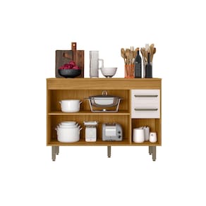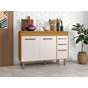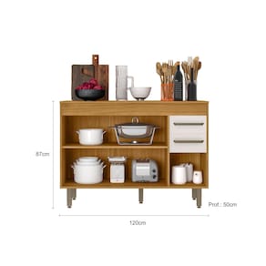 A estrutura conta com dobradiças metálicas de 26mm, 1 prateleira interna que suporta até 4kg e puxadores em polímero na cor bronze, que agregam elegância ao visual do móvel. Os pés reguláveis de 17cm em PVC modelo pirâmide garantem estabilidade e nivelamento, mesmo em pisos irregulares.