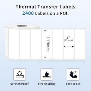 Etiquetas de transferência térmica de 3 x 1 polegada - Núcleo de 1 polegada - Adesivo permanente - 2400 etiquetas, 1 rolo - Especificações - 3 “x 1" (76 mm x 25 mm) | Núcleo de 1" | 2400 etiquetas por rolo. Cor: preto sobre branco. - Tecnologia de transferência térmica - requer o uso de uma fita para imprimir, adequada para a maioria das impressoras de etiquetas de transferência térmica. - Alta qualidade - Esses papéis para etiquetas são altamente autoadesivos, à prova de óleo, não desbotam e são graváveis, têm boa resistência a borrascos/arranhões e resistência química, podem suportar temperaturas de -65° F (-54° C) a 200° F (93° C) e têm vida útil de preservação de mais de 10 anos. - Ampla aplicação - A etiqueta pode ser usada para etiqueta de nome, adesivo de agradecimento, design de marca, design de bricolage, etiqueta de impressora de código QR, etiqueta classificada, etiqueta de tamanho, etiquetagem de número de laboratório, classificação de sapatos, bolsas e roupas, etc. - Para uso - Compatível com a Zebra e outras impressoras de transferência térmica. - Informações importantes - Essa etiqueta só pode ser usada em impressoras de transferência térmica.