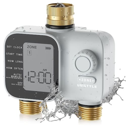 - 2 zonas programáveis separadas: os temporizadores de água Unistyle para mangueiras programáveis permitem o controle de duas zonas independentes (Zona 1 e Zona 2). Personalize os horários de início, a duração da rega (1-360 minutos) e as frequências de rega (a cada 1-12 horas ou 1-7 dias) para uma irrigação precisa do seu gramado e jardim.