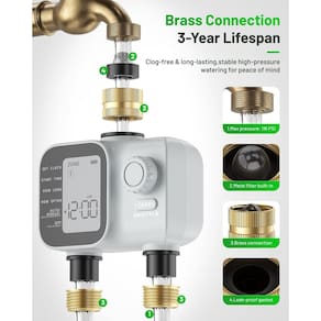 - Configuração fácil para irrigação automática: Configurar seu cronômetro de irrigação automático nunca foi tão fácil. A grande tela LCD e a operação com um botão simplificam a programação, mesmo para iniciantes. Você pode ajustar rapidamente o cronograma de irrigação usando o modo de temporizador de mangueira programável, com um intervalo de tempo de rega flexível de 1 a 360 minutos, para que você possa gerenciar seu jardim com eficiência e sem esforço.