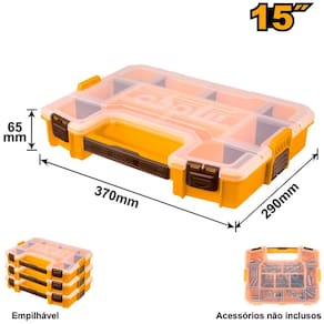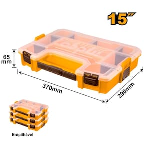 Organizador ideal para guardar miudezas, desde parafusos, buchas, bits, peças hidraulicas, itens de costura e até itens de pesca. Diferencial que podem ser empilhadas e conectadas uma na outra facilitando o transporte e evitando quedas e possiveis aberturas do organizador durante o transporte em um automóvel ou caminhão.