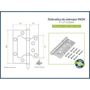Dobradiça inox sobrepor 4u0022x3u0022descrição:- dispensa rebaixo na madeira- fácil instalação, não necessita de técnico- material anti-oxidante resistente à maresia, não enferruja- eixo blindado + rolamentos anti ruídos- dobradiça 100% produzida em aço inox.- capacidade de peso: 30kg por dobradiçamedidas:- 4u0022 x 3u0022 x 2,3mm 10cm x 7,5cm aberta - espessura 2,3mm Marca: Component