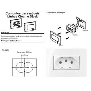 02 Tomada Para Moveis Margirius 2P T Branca 20A 250V Nbr 14136 Descrição Tomada para embutir em madeira, MDF, MDP ou derivados. Utilizada principalmente na marcenaria, ideais para peças planejadas como armários, cabeceiras, painéis, bancadas, balcões de cozinha, mesas para escritório, entre outras