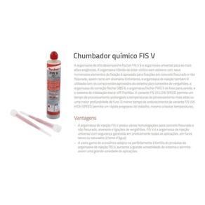 Descrição do produtochumbador químico fis va argamassa versátil para ancoragens em alvenaria e concretoa argamassa de alto desempenho fis v é a argamassa polivalente universal para as situações mais exigentes. A resina híbrida de viniléster isento de estireno, com os seus numerosos elementos de fixação, tem homologação para fixações em concreto fissurado e não fissurado, bem como em alvenaria. Além disso, a argamassa de injeção fis v também pode ser utilizada com vergalhões, o grampo metálico vbs 8 da fischer, o sistema de reconstrução de paredes expostas às condições meteorológicas fws ii e o sistema thermax de instalação por afastamento. A variante fis vs low speed permite um tempo de processamento prolongado a temperaturas mais elevadas ou um furo mais profundo. O tempo de endurecimento mais curto da variante fis vw high speed permite um avanço rápido do trabalho mesmo a baixas temperaturas.Aplicações:construções em açoconstruções em madeirabarreirasfachadasescadariasconsoles em açomáquinaspostestoldoscoberturasportõestubulaçõesgradesantenas de satélitemateriais de construção:homologada para fixações em:concreeto c20/25 a c50/60, fissurado e não-fissuradoplaca cimetíciablocos vazados de concretobloco de concretobloco cerâmicotijolo ococoncreto celulartijolo maciçoaprovados para:conexão de vergalhõesgrampo metálico vbs 8sistema de reconstrução de paredes expostas às condições meteorológicas fws iisistema thermax de instalação por afastamento Pode encontrar informação detalhada sobre os materiais de construção no documento de registo.Funcionamento:o fis v é uma argamassa num conceito híbrido de viniléster.A resina e o endurecedor são armazenados em duas câmaras separadas e não são misturados nem ativados até à extrusão com o bico misturador.A argamassa é extrudida a partir da base do furo isenta de bolhas.A argamassa faz aderir toda a superfície da haste à parede do furo e sela o furo.Os cartuchos de injeção são fáceis de utilizar com os dispensadores fischer.Os cartuchos parcialmente utilizados podem ser reutilizados substituindo o bico misturador. Marca: Não Informado