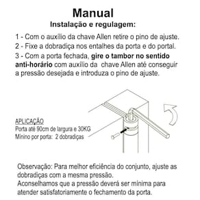 Dobradiça com Mola para fechamento automático suave das portas. Utilizada no lugar das molas aéreas funciona perfeitamente em portas pesadas e leves. Com uma mola interna de fácil regulagem da força de fechamento é super fácil de instalar, discreta mantendo a estética da porta e economiza espaço que uma mola aérea convencional ocupa. Características Medidas: 3.1/2 x 3 79 x 89mm Espessura: 2mm Material: Aço Acompanha Chave Allen para regulagem: Sim Capacidade de peso: 20 kg por dobradiça Dica Em portas de 2,10 de altura, mesmo pesando menor do que 60 kg o ideal é ser colocado 3 dobradiças para um bom funcionamento da mola Instruções para Instalação e regulagem 1 Encaixe a chave Allen na cavidade sextavada 2 Retire o Pino de Ajuste girando e pressionando a chave contra a dobradiça 3 Fixe a dobradiça de maneira convencional, depois de retirar o pino de ajuste 4 Com a porta fechada, encaixe novamente a chave allen na cavidade sextavada 5 Gire-a em sentido anti-horário, pressionando-a contra a dobradiça 6 Recoloque o pino de ajuste no orifício mais à esquerda 7 Cada orifício corresponde a uma pressão para fechar a porta. Quanto mais girar a chave a direita e colocar o pino a esquerda, maior será a pressão. ajuste da maneira necessária a sua necessidade ----------------------------------------------------------------------------------------------------------------------- Marca: Não Informado Ean: 1000000203394