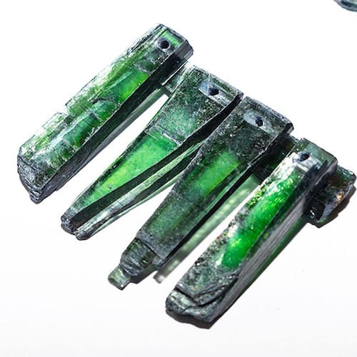 03 Lâminas de Vivianita Pedra Bruta Natural com Furo Horizontal: Essas pedras naturais vêm com um furo horizontal de aproximadamente 1mm de espessura, perfeito para a montagem de artesanato, pingentes, colares ou pulseiras.