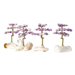 Conjunto com 4 Árvores da Felicidade artesanais, produzidas com ametista natural rolada e base de drusa de cristal de garimpo. Cada peça é feita à mão, com pedras coladas em galhos de arame torcido, finalizadas com resina e fixadas sobre uma base natural, formando um item decorativo exclusivo e delicado. Produto ideal para revenda, presentes criativos, decoração de ambientes e colecionadores de minerais naturais. Detalhes do Produto:\nQuantidade: 4 unidades\nTipo da Pedra: Ametista\nCor da Pedra: Roxo (foto ilustrativa)\nFormato da Pedra: Rolada\nTransparência: Opaca\nDimensões por Unidade: Aproximadamente 9 cm de altura x 5 cm de largura\nPeso Médio por Unidade: Cerca de 100 g (variações conforme o lote)\nBase: Drusa de cristal natural\nMontagem: Galhos de arame torcido com resina\nOrigem: Curvelo – Minas Gerais, Brasil\nInformações Adicionais: Por se tratar de pedra natural, podem ocorrer variações de tonalidade, textura e estrutura. Inclusões visíveis e marcas internas são características comuns de minerais extraídos de forma bruta. Para manter a aparência da peça, recomenda-se hidratação ocasional com óleo mineral. Marca: Não Informado