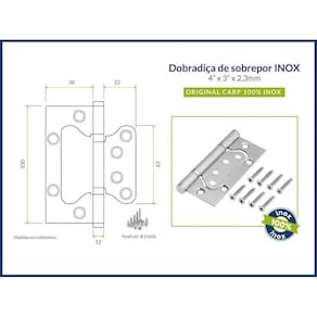 Dobradiça inox sobrepor 4 x 3descrição:- dispensa rebaixo na madeira- fácil instalação, não necessita de técnico- material anti-oxidante resistente à maresia, não enferruja- eixo blindado + rolamentos anti ruídos- dobradiça 100% produzida em aço inox.- capacidade de peso: 30kg por dobradiçamedidas:- 4 x 3 x 2,3mm 10cm x 7,5cm aberta - espessura 2,2mm Marca: Component