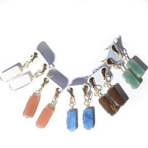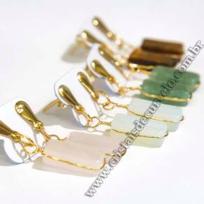 Brincos com pedras naturais mistas em formato retangular ranhurado, montados com pino e tarracha em metal com banho flash dourado. Lapidação artesanal feita manualmente, com polimento em tambor vibratório para realce do brilho e acabamento refinado.