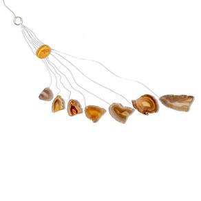 Mensageiro dos Ventos feito com chapas de ágata aproveitadas, cuidadosamente lapidadas e polidas dos dois lados. Ideal para quem busca um ambiente mais leve, com sensação de paz e tranquilidade. Perfeito para uso em varandas, sacadas ou entradas, o sinaleiro emite um som suave que contribui para um ambiente equilibrado. As pedras naturais filtram as energias do local e tornam o espaço mais agradável.