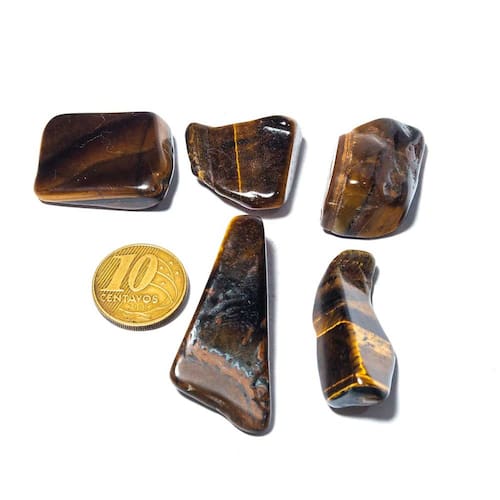 Olho de Tigre Rolado Natural – 5 Unidades (Importado da África, Lapidado em MG) | Pedra para Proteção, Intuição e Prosperidade Descrição do ProdutoAdquira 5 unidades de Olho de Tigre Rolado, pedras naturais importadas da África e lapidadas artesanalmente em Curvelo, MG. Com brilho intenso e coloração marrom-dourada reluzente, estas pedras são ideais para colecionadores, artesãos ou uso esotérico. Significados e Benefícios Espirituais\nDesenvolve a intuição e o instinto de proteção\nAfasta perigos e energias negativas\nAtrai dinheiro, estabilidade e amizades sinceras\nAssociado ao elemento Terra e ao chakra do plexo solar\nDetalhes do Produto\nNome da Pedra: Olho de Tigre (5 Unidades)\nCor: Marrom com reflexos amarelo-dourados\nLapidação: Rolado (realce de brilho)\nBrilho: Opaco com brilho muito intenso\nDimensões Aproximadas: 30 a 45mm\nPeso Total: 27g (pode variar conforme o estoque)\nOrigem: África (manufatura em Curvelo/MG)\nImagem meramente ilustrativa\nImportante Saber\nPor serem pedras naturais, podem apresentar variações únicas em cor, tamanho e padrões.\nPossíveis inclusões internas fazem parte da autenticidade da pedra bruta de garimpo.\nPara manter o brilho, recomenda-se hidratar com óleo mineral ocasionalmente.\nProduto único – confira outras opções de Olho de Tigre disponíveis na loja!\nIdeal para: \nColecionadores de minerais\nTerapias holísticas e proteção espiritual\nMontagem de bijuterias e pingentes\nPresentes com significado Marca: CristaisdeCurvelo
