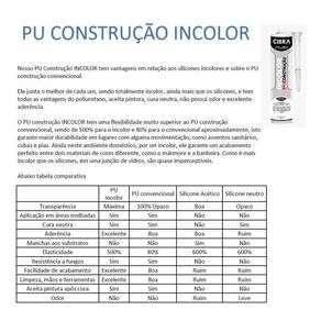 Pu construção incolornosso pu construção incolor tem vantagens em relação aos silicones incolores e sobre o pu construção convencional.Ele junta o melhor de cada um, sendo totalmente incolor, ainda mais que os silicones, e tem todas as vantagens do poliuretano, aceita pintura, cura neutra, não possui odor e excelente aderência.O pu construção incolor tem uma flexibilidade muito superior ao pu construção convencional, sendo de 500% para o incolor e 80% para o convencional aproximadamente, isto garante maior durabilidade em lugares com alguma movimentação, como assentos sanitários, cubas e pias. Ainda neste ambiente doméstico, por ser incolor, ele garante um acabamento perfeito entre dois materiais de cores diferente, como o mármore e a banheira. Como é mais incolor que os silicones, em uma junção de vidros, são quase imperceptíveis.Na galeria de imagens conseguem ver os benefícios/diferenças do pu construção incolor em comparação aos pu's convencionais Marca: Cibra Selantes