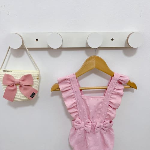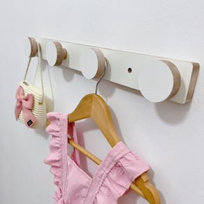 Dimensão do cabideiro: Base parede: 45cm largura X 5cm altura X 1,5cm profundidade; Gancho: 6cm largura X 5cm altura X 1,5cm profundidade; Suporte para gancho: 3cm largura X 1,5cm profundidade; Material: MDF Melamínico 15 mm com bordas cru (sem pintura).