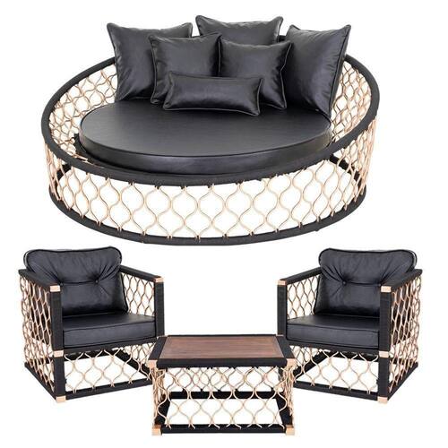 Chaise com almofadas, Poltronas e Mesa de centro com tampo de madeira - TRAMA