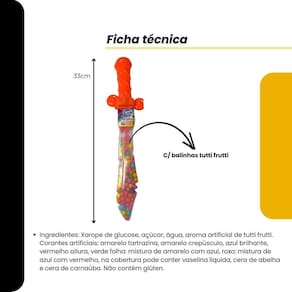 Uma aventura tem início com a nossa fabulosa espada de 33 cm, um brinquedo que une diversão e sabor em um só produto Perfeita para criar histórias e situações emocionantes, essa espada não é apenas um acessório de brincadeira, mas um passaporte para a imaginação dos pequenos Por que escolher a nossa Espada Diversão Garantida: Deixe a criançada se transformar em guerreiros samurais ou piratas audazes Cada espada traz 30 gramas de deliciosas balinhas sabor tutti frutti, uma recompensa perfeita após a batalha Surpresa Colorida: Com cores de cabo que variam conforme a disponibilidade do , cada criança receberá um modelo único e especial, tornando o presente ainda mais emocionante Sabor Irresistível: As pastilhas coloridas são uma explosão de sabor, fazendo cada brincadeira ser ainda mais doce e prazerosa. Uma maneira divertida de premiar a criatividade dos pequenos Segurança e Qualidade: Produzida com ingredientes cuidadosamente selecionados, nossa espada não contém glúten, garantindo uma escolha segura para a diversão Detalhes do Produto: Ingredientes: Xarope de glucose, açúcar, água, e aroma artificial de tutti frutti. A embalagem pode conter vaselina líquida, cera de abelha e cera de carnaúba. Informações Nutricionais: Porção de 5g tem 20 kcal, com 5g de carboidratos - um treat delicioso e divertido Não fique de fora dessa diversão Adquira agora e prepare-se para uma jornada cheia de aventuras e gostosuras Estoques limitados - garanta já a sua e dê asas à imaginação dos pequenos Ingredientes: Xarope de glucose, açúcar, água, aroma artificial de tutti frutti. Corantes artificiais: amarelo tartrazina, amarelo crepúsculo, azul brilhante, vermelho allura, verde folha: mistura de amarelo com azul, roxo: mistura de azul com vermelho, na cobertura pode conter vaselina líquida, cera de abelha e cera de carnaúba. Não contém glúten. Informações Nutricionais Porção de 5g 1 colher de chá Valor energético 20kcal 1% Carboidratos 5g 2% Não contém quantidades significativas de proteínas, gorduras totais, gorduras saturadas, gorduras trans, fibra alimentar e sódio. Ce-bri/innac 00625-001 Nm 300/2002 Espadas com Doces para Crianças Lembrancinha de Festa Infantil Doces em Forma de Espada Balinhas para Festa de Criança Lembrancinha divertida para crianças Brinquedo com Doces para Festas Presentes para Festa Infantil Doces para Lembrancinhas de Festa Brinquedo e Doce para Crianças Espadas com Balinhas 30g Doces personalizados para festas Brinquedo com Guloseimas Doces de prisão cheio de diversão Festa infantil lembrancinha divertida Presentinho de festa com doces
