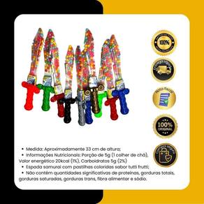 Uma aventura tem início com a nossa fabulosa espada de 33 cm, um brinquedo que une diversão e sabor em um só produto Perfeita para criar histórias e situações emocionantes, essa espada não é apenas um acessório de brincadeira, mas um passaporte para a imaginação dos pequenos Por que escolher a nossa Espada Diversão Garantida: Deixe a criançada se transformar em guerreiros samurais ou piratas audazes Cada espada traz 30 gramas de deliciosas balinhas sabor tutti frutti, uma recompensa perfeita após a batalha Surpresa Colorida: Com cores de cabo que variam conforme a disponibilidade do , cada criança receberá um modelo único e especial, tornando o presente ainda mais emocionante Sabor Irresistível: As pastilhas coloridas são uma explosão de sabor, fazendo cada brincadeira ser ainda mais doce e prazerosa. Uma maneira divertida de premiar a criatividade dos pequenos Segurança e Qualidade: Produzida com ingredientes cuidadosamente selecionados, nossa espada não contém glúten, garantindo uma escolha segura para a diversão Detalhes do Produto: Ingredientes: Xarope de glucose, açúcar, água, e aroma artificial de tutti frutti. A embalagem pode conter vaselina líquida, cera de abelha e cera de carnaúba. Informações Nutricionais: Porção de 5g tem 20 kcal, com 5g de carboidratos - um treat delicioso e divertido Não fique de fora dessa diversão Adquira agora e prepare-se para uma jornada cheia de aventuras e gostosuras Estoques limitados - garanta já a sua e dê asas à imaginação dos pequenos Ingredientes: Xarope de glucose, açúcar, água, aroma artificial de tutti frutti. Corantes artificiais: amarelo tartrazina, amarelo crepúsculo, azul brilhante, vermelho allura, verde folha: mistura de amarelo com azul, roxo: mistura de azul com vermelho, na cobertura pode conter vaselina líquida, cera de abelha e cera de carnaúba. Não contém glúten. Informações Nutricionais Porção de 5g 1 colher de chá Valor energético 20kcal 1% Carboidratos 5g 2% Não contém quantidades significativas de proteínas, gorduras totais, gorduras saturadas, gorduras trans, fibra alimentar e sódio. Ce-bri/innac 00625-001 Nm 300/2002 Espadas com Doces para Crianças Lembrancinha de Festa Infantil Doces em Forma de Espada Balinhas para Festa de Criança Lembrancinha divertida para crianças Brinquedo com Doces para Festas Presentes para Festa Infantil Doces para Lembrancinhas de Festa Brinquedo e Doce para Crianças Espadas com Balinhas 30g Doces personalizados para festas Brinquedo com Guloseimas Doces de prisão cheio de diversão Festa infantil lembrancinha divertida Presentinho de festa com doces