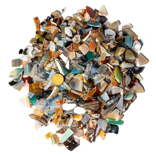 Este pacote contém 1kg de retalhos de Ágata Colorida, provenientes de lapidações naturais. As pedras possuem alto brilho devido ao polimento, embora sejam cacos e retalhos de cortes, com variações de tamanho e cor. São perfeitas para criar orgonites, mandalas, decoração de aquários, jardins de inverno ou qualquer outro projeto criativo. Detalhes do Produto:\nNome das Pedras: Ágata Mista - Diversas Cores\nCores das Pedras: Azul, Rosa, Lilás, Verde, entre outras (Foto ilustrativa)\nClaridade das Pedras: Brilhantes, sem transparência\nCorte das Pedras: Retalho de Lapidação (cacos e pedaços)\nMedidas das Pedras: Variadas de 10mm a 35mm, tamanhos médios, podendo ser maiores ou menores\nPeso Total: Aproximadamente 1kg por pacote\nObservação:\nAs pedras são lavadas em máquinas, podendo conter pequenas impurezas como pedaços de tijolos, concreto ou galhos.\nA separação manual aumentaria o custo do produto, por isso, o pacote contém até 30g a mais como margem de erro.\nCaso precise de pedras específicas, não compre o pacote misto. Consulte compra das pedras individuais.\n Adquira já e use a versatilidade das Ágatas coloridas para seus projetos criativos! Marca: Não Informado