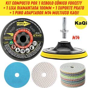 1 Lixa Grão 4 Pol. 100mm Diamantada + 1 Rebolo Cônico 45 Graus + 1 Disco Prato + 1 Pino M14 KaQi GRÃO: 1 Lixa g200 + Kit Kit 1 Lixa Diamantada Disco 4 Polegadas 100mm KaQi + 1 Rebolo Grão 120 Copo Cônico 45 Graus 4 Polegadas M14 Forcety. + 1 Suporte Prato Disco 100mm M14 KaQi + 1 Pino Adaptador Multiuso Rosca Universal M14 KaQi. Para Desbastes, Polimentos, Acabamentos, Boleamentos, Lixamentos a Seco e Úmido. Ideal para profissionais e entusiastas de reformas e construção. Alta qualidade, resistência e desempenho superior. Transforme o acabamento das suas superfícies com o Kit 1 Lixa Grão 4 Pol. 100mm Diamantada + 1 Rebolo Cônico 45 Graus + 1 Disco Prato + 1 Pino M14 Desenvolvido para oferecer o melhor polimento e acabamento, é perfeito para quem busca resultados profissionais, tanto em pedras como granitos, mármores, cerâmicas, quanto ardósia, calcário, dekton, quartzo, porcelanato, pedra projetada, concreto, nanoglass, super nano, vidro e muito mais. Seu lixamento pode ser a seco e a úmido, o que proporciona um processo mais rápido, sem gerar calor excessivo. Assim, é possível garantir um resultado sem manchas ou falhas, e ainda favorece um efeito brilho d'água incrível O Rebolo Copo Cônico 10x5cm Grão 120 Forcety é ideal para desbastes, retificações, boleamentos e acabamentos. Projetado para oferecer eficiência, durabilidade, confiabilidade e resultados excepcionais, é perfeito para profissionais e entusiastas de reformas e construções. Não à toa, é o rebolo número 1 das marmorarias, azulejistas e oficinas de todo Brasil O Disco 100mm e o pino adaptador M14 podem ser utilizados em conjunto com as lixas e com o rebolo. Com sistema de gruda e desgruda fácil, podem utilizadas em lixadeiras, esmerilhadeiras, politrizes, furadeiras, parafusadeiras. Permite, assim, ampliar a gama de usos do kit. Modo de uso: aceita lixamento tanto, a úmido, quanto, a seco. No úmido utiliza-se com uma politriz úmido de qualquer marca que aceite um prato com rosca M14 ou máquina polidora utilizada em indústrias de mármore e granito para polimento nas bordas da pedra. Quando o uso é a seco, aceita lixadeiras, esmerilhadeiras e politrizes comuns. Em ambos os casos, basta encostar o costado de vellcro ao disco prato suporte que também tenha o mesmo sistema, e então fazer o devido uso. Conteúdo da embalagem: 1 Lixa DÁgua 4 Pol. 100mm Disco Diamantado KaQi GRÃO. + 1 Rebolo Grão 120 Copo Cônico 45 Graus 4 Polegadas M14 Forcety. + 1 Suporte Prato Disco 100mm M14 KaQi + 1 Pino Adaptador Multiuso Rosca Universal M14 KaQi. Especificações Lixa: Diâmetro: 100mm 4 Polegadas . Furo central: 1,3cm diâmetro. Espessura 1 unidade: 0,4cm. Maleabilidade: flexível. Lixamentos: seco e úmido. RPM: ideal entre 3000 a 5000 rotações por minuto. Material da lixa: diamante sintético industrial e resina premium. Costado: tipo vellcro. Fácil de fixar e remover. Especificações Rebolo: Trabalho: a seco ou refrigerado com água. Diâmetro: 4 Polegadas 100mm 10,16cm x altura 5,08cm. Velocidade: 9023RPM. Rosca: M14. Material: Carbeto de Silício SiC com diamantes. Feito para ser conforme norma ABNT NBR 15230. Especificações Prato Suporte: Diâmetro do disco: 100mm 4 Polegadas . Modelo do disco: M14 com superfície tipo vellcro. RPM: até 12000. Rosca: padrão M14 14mm . Especificações Pino Adaptador M14: Para Furadeira Parafusadeiras, Politrizes, Lixadeiras e Esmerilhadeiras. Fixa em discos pratos M14 para uso com lixas, boinas, espumas de polir, entre outros acessórios. Rosca: M14 14mm . Pino largura: 8mm. Altura total: 4,4cm.