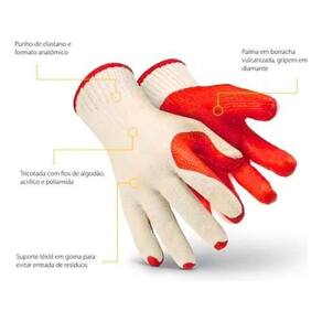 Composição: Algodão, Acrílica e Látex. Acabamento: Vulcanizado Antiderrapante Palmar. Tamanho: 9 G o mais utilizado. Embalagem: 01 par. Cor: Branco e Vermelha. Ca Certificado de Aprovação : 49969 Indica que o produto foi aprovado nos requisitos de segurança estabelecidos pelos órgãos competentes . Norma: EN 388 Especificações de resistência mecânica, proporcionando informações sobre a durabilidade e proteção oferecidas pela luva .