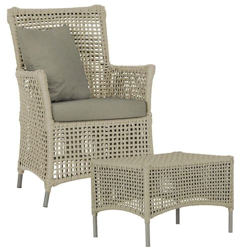A corda nautica adiciona um toque de rusticidade moderna, enquanto o estofado impermeavel garante que sua poltrona esteja sempre impecavel, mesmo apos uma chuva inesperada ou um acidente com liquidos.