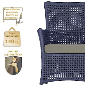 A corda nautica adiciona um toque de rusticidade moderna, enquanto o estofado impermeavel garante que sua poltrona esteja sempre impecavel, mesmo apos uma chuva inesperada ou um acidente com liquidos.