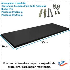 Prateleira Preta 30x10cm MDF com Suporte Ideal Para Organização, Decoração, Cozinha, Banheiro, Sala.Especificações:Comprimento: 30 cmProfundidade: 10 cmEspessura: 1,5 cmMaterial: MDF de qualidadeAcabamento: Fita de borda para maior durabilidadeInclui: Kit para fixação na paredeMontagem:Produto enviado desmontado para garantir a integridade no transporte.Montagem simples, utilizando apenas uma chave Philips. (As cantoneiras precisam ser fixadas na parte superior da prateleira, para maior resistência.)Observações Importantes:Disponível também em outras medidas. para conhecer todas as opções!Boas compras!Equipe GP Marca: Não Informado