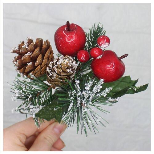 Possui 1 Ramo, com 2 Maça, 2 Pinhas. Altura: 17 cm Cor: Verde, Vermelho, Branco. Material: Plástico, Isopor.